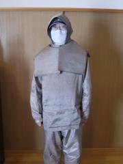Wear the vest and the scarf of 8- layer shield cloth to protect my chest and neck.