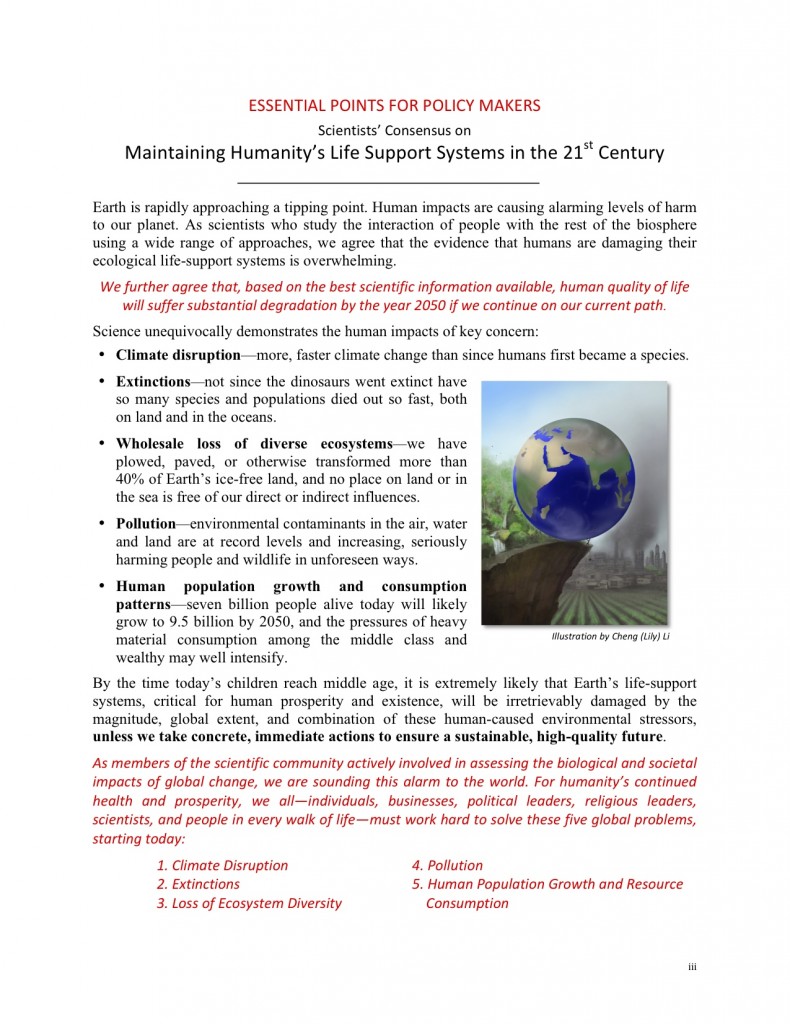 Global scientists sign message of Scientific Consensus on Maintaining Humanity’s Life Support Systems in the 21st Century:
