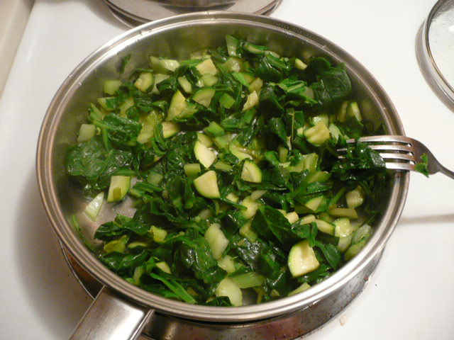 That time I used some frozen garlic scape pieces, zucchini, bok choy and spinach.