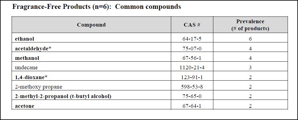 And finally, (for this blog post, there is much more in the research paper) here are the toxic VOCs found in commercial fragrance free products