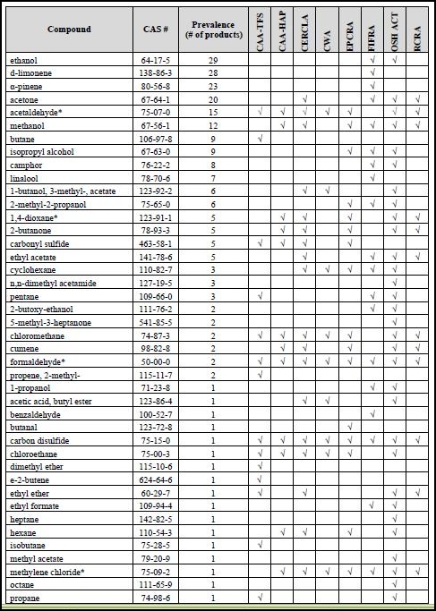 – Among the most prevalent VOCs in the products (found in at least half of the products), 80% are classified as toxic or hazardous under U.S. federal laws: ethanol, d-limonene, α-pinene, and acetone.