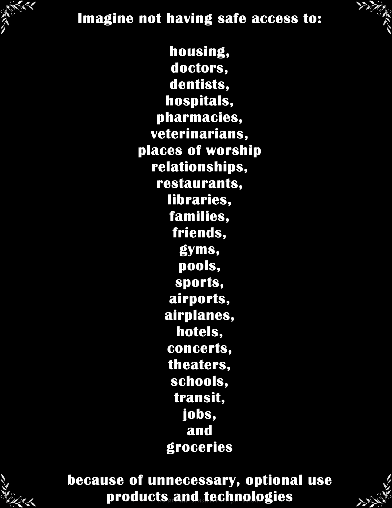 Due to everyday barriers, she cannot access the places most people go, even just for a change of scenery. For people with severe MCS/ES, there are no accessible libraries, no malls, no movie houses, no vacations, no restaurants, no workplaces (see image below for more). There’s no anywhere but home, the only safe place in a world that is full of exposures that are dangerous to one’s health and abilities, and for that safe home to be taken away without having a safe replacement available, is nothing less than cruel! Would you force a peanut allergic person into a new home full of and surrounded by peanuts because you could? Because the book of widgets said you should?