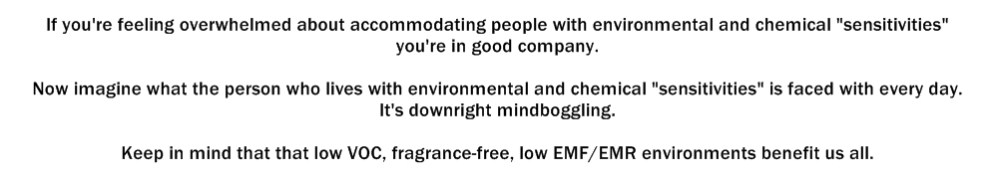 When seen like that, it becomes clear that making places accessible for people with MCS/ES actually serves to provide healthier environments for everyone. Who wouldn’t want that to happen?