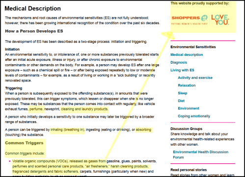 (An analogy to that statement in this doc is that the fragrance industry and Shopper’s are a vector for MCS/ES because they sell perfumes, scented products and lots of other toxic products.)