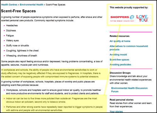 Don’t they know about the clinic they house? Don’t they know about their own fragrance-free policy? Don’t they see the conflicts of interest? Don’t they see anything wrong with promoting an industry that sells health harming products on the hospital website?
