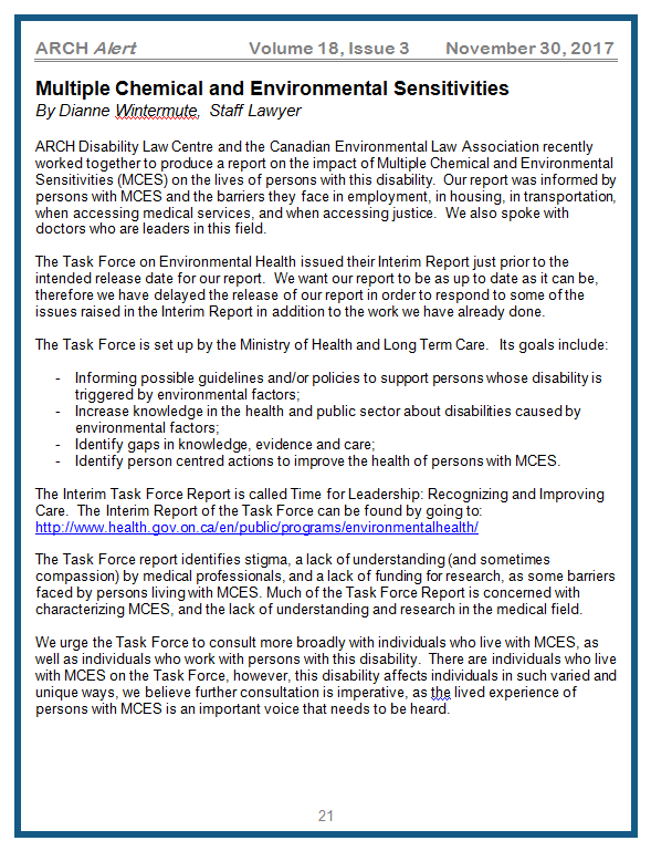The ARCH Disability Law Centre and the Canadian Environmental Law Association (CELA) announced in September of 2016 that they were working on a report about the challenges faced by people with multiple chemical and/or environmental sensitivities.