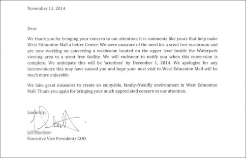 I would be very interested if you would be willing to share the email you sent to West Edmonton Mall regarding the scent free washroom. There are a number of places I would like to send something like that to in Toronto.