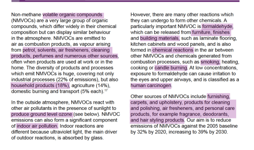 Indoors, while NMVOCs do not react with sunlight in the same way as they do outdoors, they do still react in the air to form other chemicals. For example, many fragrances in common household and personal care products include limonene and alpha pinene (responsible for citrus and pine scents). These have a low level of toxicity, but once released into the air indoors they can react to form new chemicals. These include harmful substances such as formaldehyde, a well understood secondary product of fragrance chemicals.