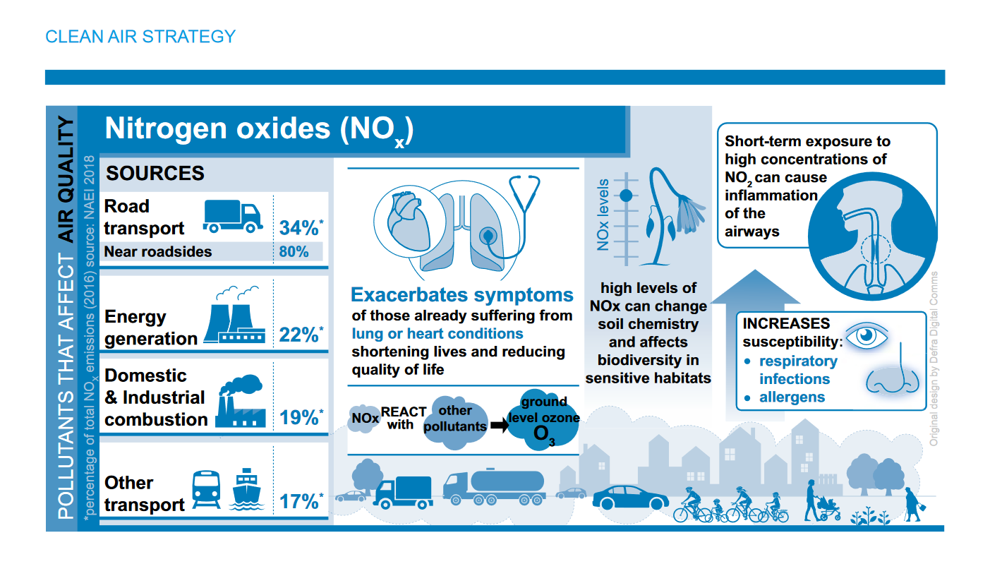 “Low level ozone also has an impact on health. This is formed when emissions of NOx and NMVOCs react together in the atmosphere and, at higher concentrations, can cause breathing problems, trigger asthma, reduce lung function and cause lung diseases …”