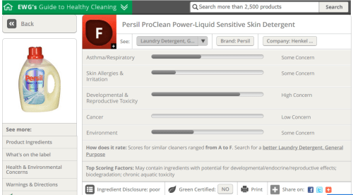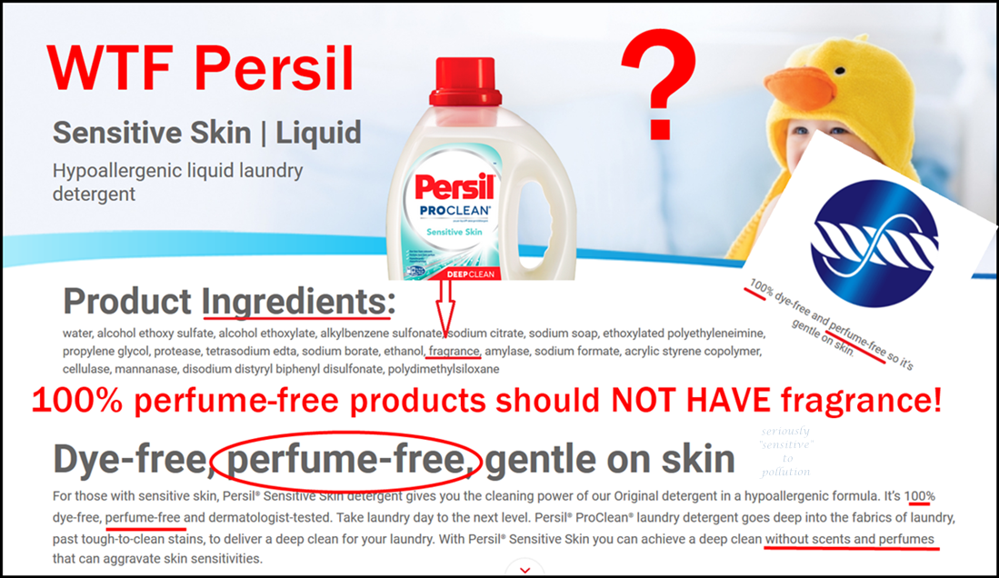 I used their contact page to send them this note: “The product’s web page states: “It’s 100% dye-free, perfume-free and dermatologist-tested. Take laundry day to the next level. … With Persil® Sensitive Skin you can achieve a deep clean without scents and perfumes that can aggravate skin sensitivities.” The ingredients list on the product has “Fragrance”. The Environmental Working Group gives this product an “F” and it may be because you use toxic “Fragrance” chemicals in it. Please correct you bottle advertising as it is not fragrance free per the ingredients and it is misleading. Under the FCC, The Division of Advertising Practices protects consumers from unfair or deceptive advertising and marketing practices that raise health and safety concerns, as well as those that cause economic injury. This is deceptive and can cause harm to the wrong individual who purchases this product and reacts to the toxic synthetic fragrances. “