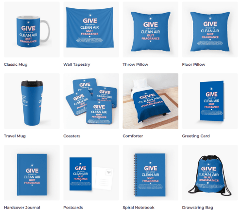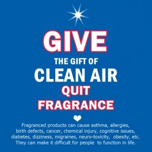 This QUIT FRAGRANCE image is available on +71 products at Redbubble, via Art on a Mission, who’s “purpose is to draw attention to our illness (ME…many people with ME also have MCS/ES), while helping to meet the needs and make a difference in the lives of our fellow sufferers.”