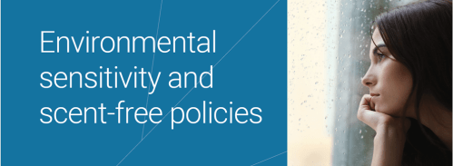 Image description: “Environmental sensitivity and scent-free policies” text on a blue background to the left, with a photo of a dark haired woman resting her chin on her hand, while looking wistfully (towards the title  text) out a window with rain drops on it, on the right side.