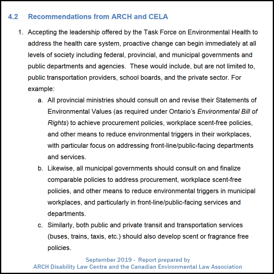 a. As described in Recommendation 1 above, corporate workplace policies should be developed to address procurement, scent-free policies, and other means to reduce environmental triggers in workplaces, particularly in front-line/public-facing services and departments,