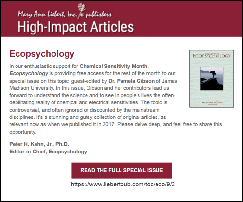 “In our enthusiastic support for Chemical Sensitivity Month, Ecopsychology is providing free access for the rest of the month to our special issue on this topic, guest-edited by Dr. Pamela Gibson of James Madison University. In this issue, Gibson and her contributors lead us forward to understand the science and to see in people’s lives the often-debilitating reality of chemical and electrical sensitivities. The topic is controversial, and often ignored or discounted by the mainstream disciplines. It’s a stunning and gutsy collection of original articles, as relevant now as when we published it in 2017. Please delve deep, and feel free to share this opportunity.”