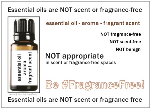 That however is not the main point here, which is that essential oils are NOT fragrance-free, and they are NOT appropriate for fragrance-free spaces, which have come about to protect people from harm.