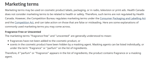 Masking agents can be listed individually, or under the term “fragrance” or “parfum” on the list of ingredients.