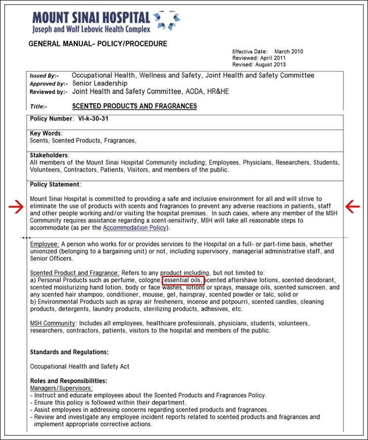 “Mount Sinai Hospital is committed to providing a safe and inclusive environment for all and will strive to eliminate the use of products with scents and fragrances to prevent any adverse reactions in patients, staff and other people working and/or visiting the hospital premises.”