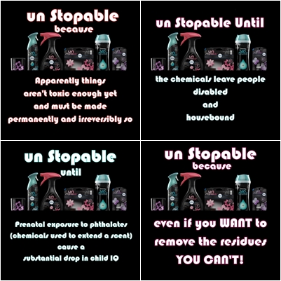 Apparently we also don’t deserve to know what we’d be inhaling if we use these things! P&G will only refer us to the self-regulated fragrance industry’s voluntarily disclosed list of over 3000 ingredients, most of which are petroleum derived. (Scroll down for a PDF of the list, which took quite a bit of sleuthing around their other website to find).