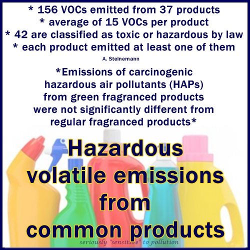 “This study found 156 different VOCs emitted from the 37 products, with an average of 15 VOCs per product. Of these 156 VOCs, 42 VOCs are classified as toxic or hazardous under US federal laws, and each product emitted at least one of these chemicals. Emissions of carcinogenic hazardous air pollutants (HAPs) from green fragranced products were not significantly different from regular fragranced products.”