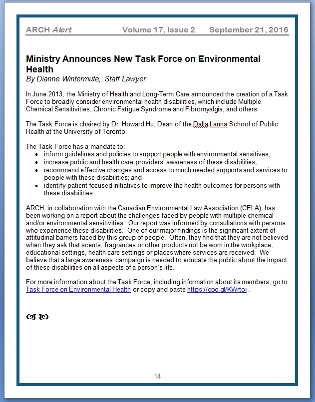The ARCH Disability Law Centre and the Canadian Environmental Law Association (CELA) announced in September of 2016 that they were working on a report about the challenges faced by people with multiple chemical and/or environmental sensitivities.